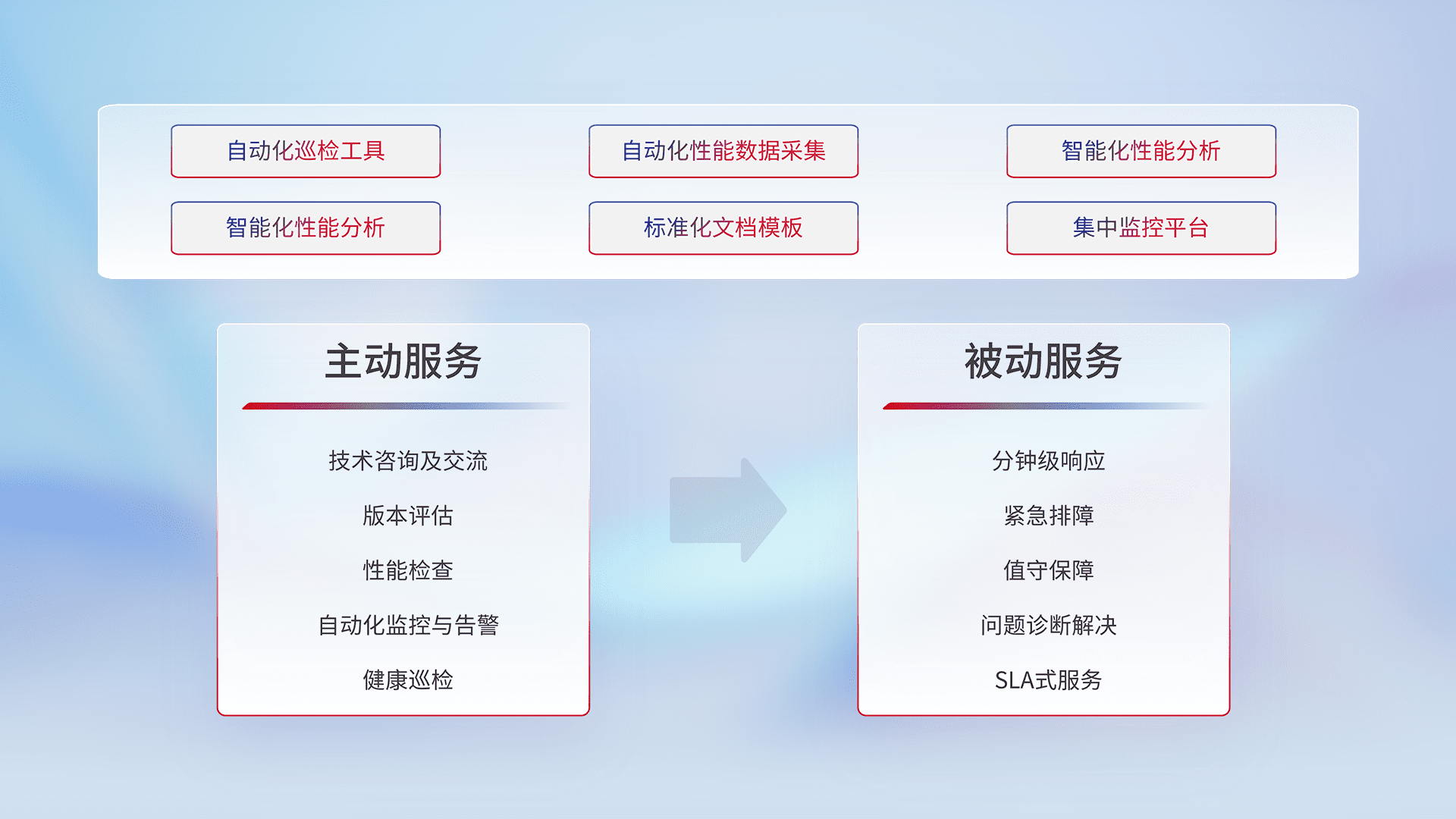 智能化工具和标准化文档,,,保障服务质量,,提供主动服务(包含技术咨询、、版本评估、、、性能检查、、自动化监控与告警、、、、健康巡检)和被动服务包含(分钟级响应、、紧急排障、、值守保障、、问题诊断解决、、SLA服务)。。